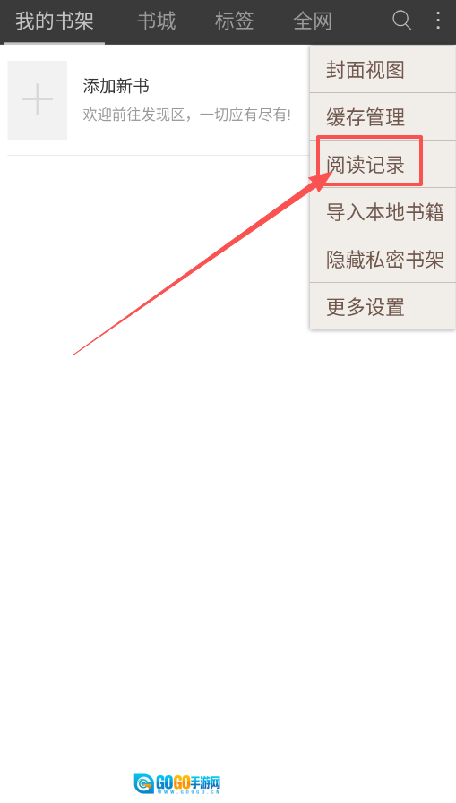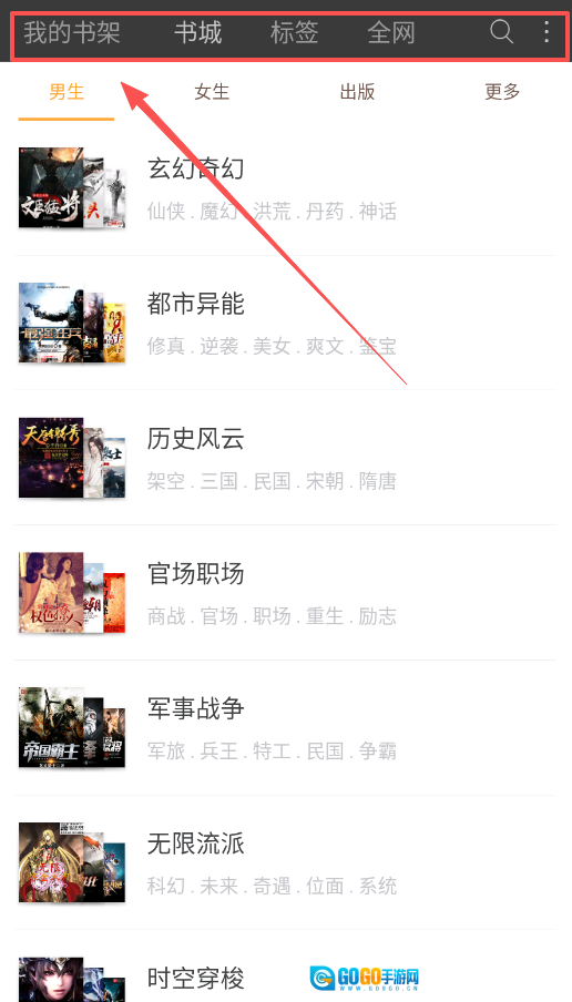 主界面底部设有“书架”“书城”“标签”“全网”四个导航选项,若要找书,建议先进入“书城”这个大类,之后再从中挑选“历史风云”之类的具体分类。