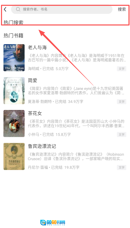 2、热门搜索中的书籍大多可免费阅读,像《老人与海》有5万字,《鲁宾逊漂流记》近20万字,均为完整版且无需额外付费。