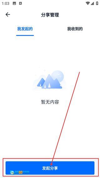 2、进入分享管理页面后,点击底部的【发起分享】按钮,即可打开选择目标文件的界面,以便挑选需要分享的文件。