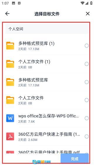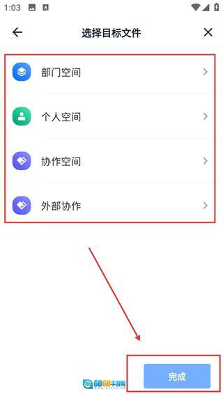 3、在选择目标文件的页面中选定对应的空间分类,确认选择后点击【完成】按钮,即可进入该空间的文件列表页面。