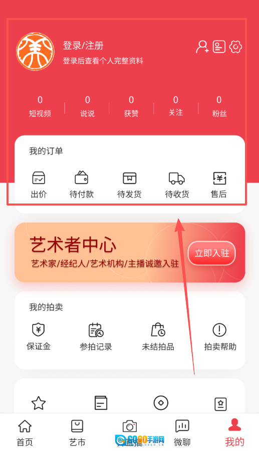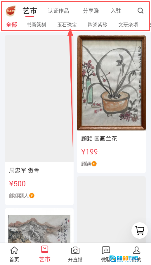 3、进入“艺市”板块,这里仿佛一个艺术小集市,你能够按照类别查看所有作品,例如书画篆刻、玉石珠宝之类。