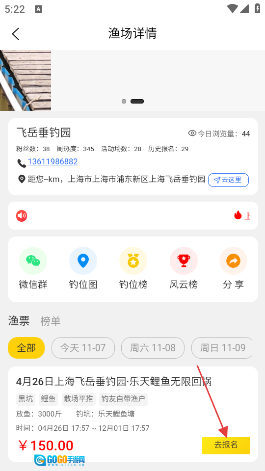 3、进入渔场详情页面后,点击【去报名】按钮,即可跳转至渔讯详情页面。