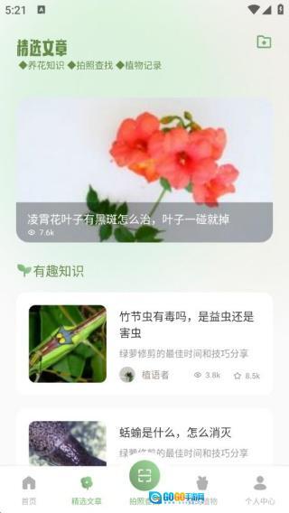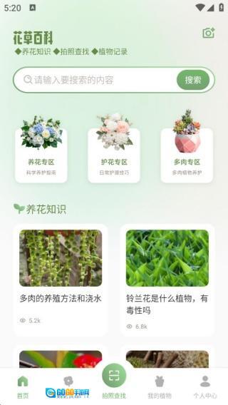 首页设有花草百科知识板块,养花技巧清晰易懂,同时支持植物记录功能。