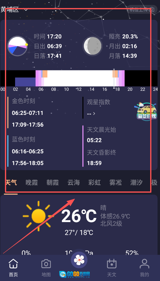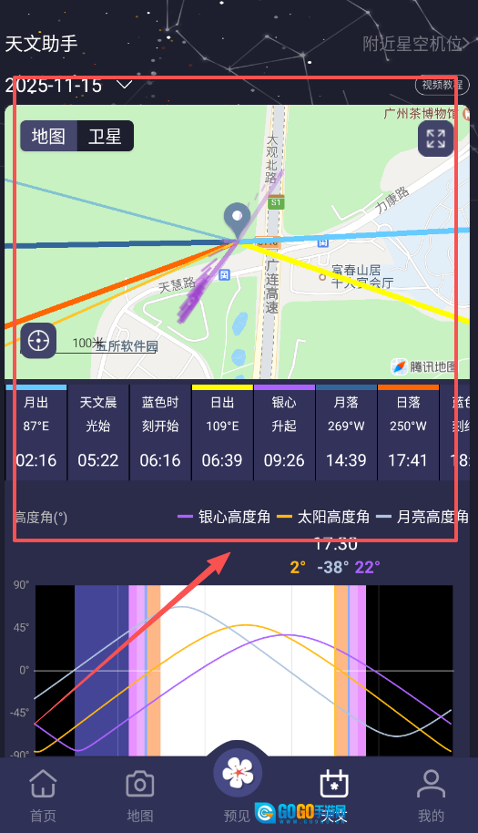 4、打开天文助手界面,能够查看月出、银心升起等具体天文事件的时间,还能了解太阳和月亮的高度角,便于轻松规划星空摄影计划。