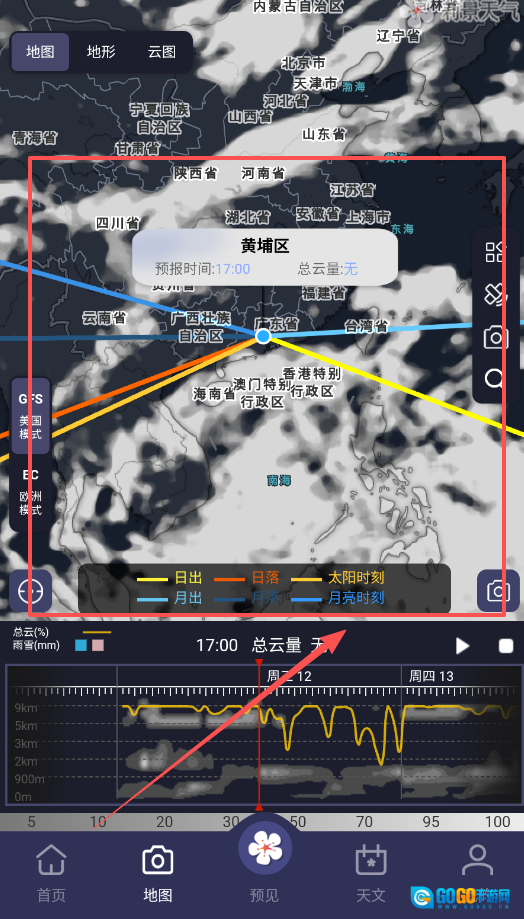3、切换至地图页面,可选择地图或卫星显示模式,查看全国范围内的云量及雨雪分布情况,还能通过拖动地图定位到目标地区。