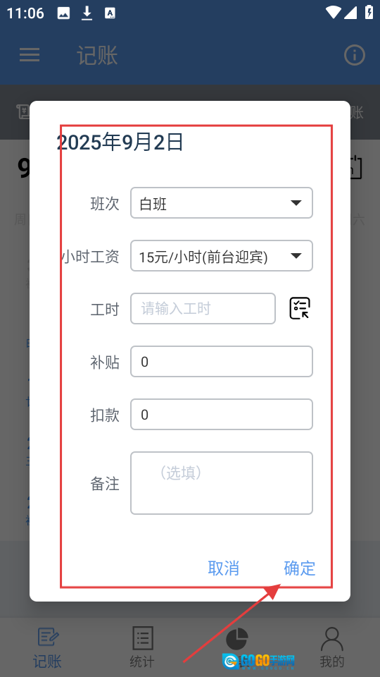2、打开记账弹窗后,依次选择对应的班次和小时工资标准,准确输入工时等相关信息,补充好备注内容,最后点击【确定】按钮,即可完成此次记账操作。