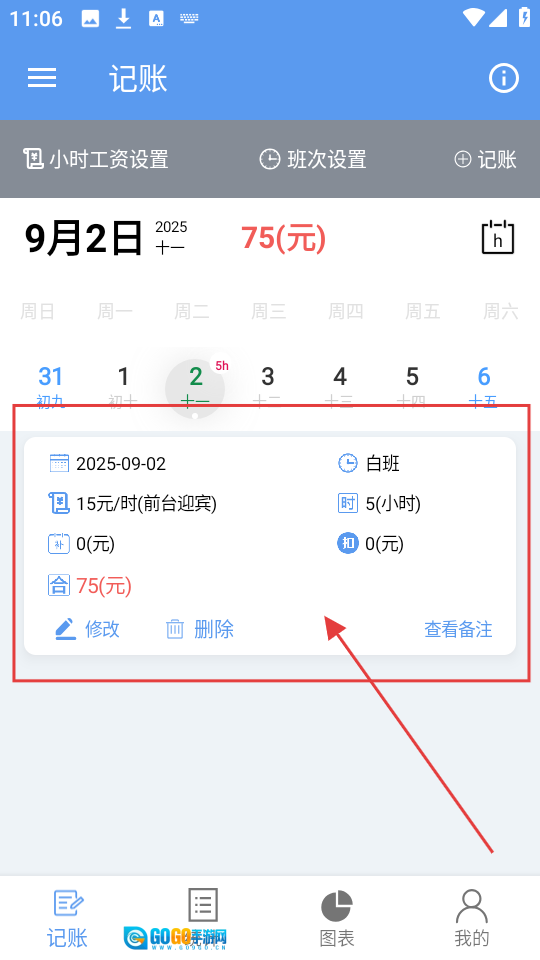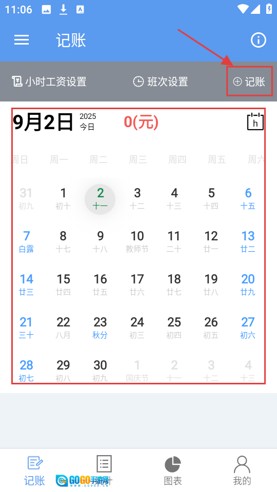 进入应用后,能看到日历界面以及【小时工资设置】【班次设置】【记账】等功能按钮,点击【记账】按钮就可以添加当天的收入记录。