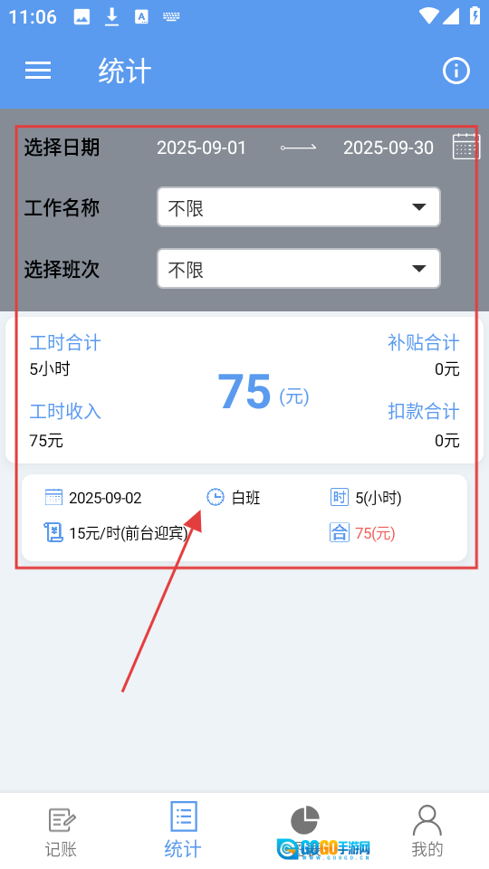 4、进入【统计】页面后,能够通过选择日期、工作名称、班次等条件进行筛选,进而查看工时的合计统计信息,同时也能查看具体的记账记录。