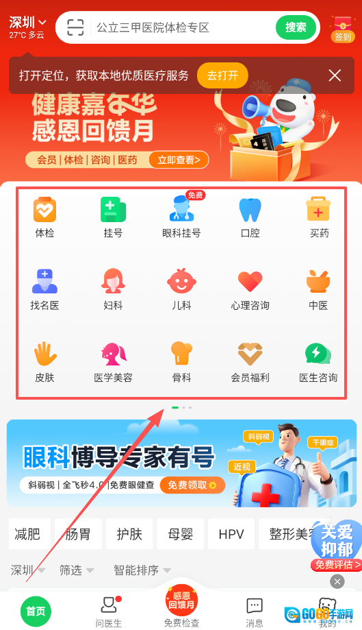 进入主界面后,不用急着直接找科室,可以先关注一下顶部的搜索栏以及“公立三甲体检”这类专题活动,这样能更快速地找到对应的服务。