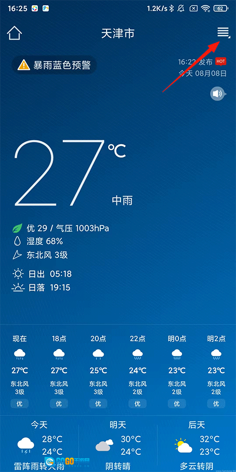 1、在本地天气预报首页,点击右上角的四横线展开按钮。