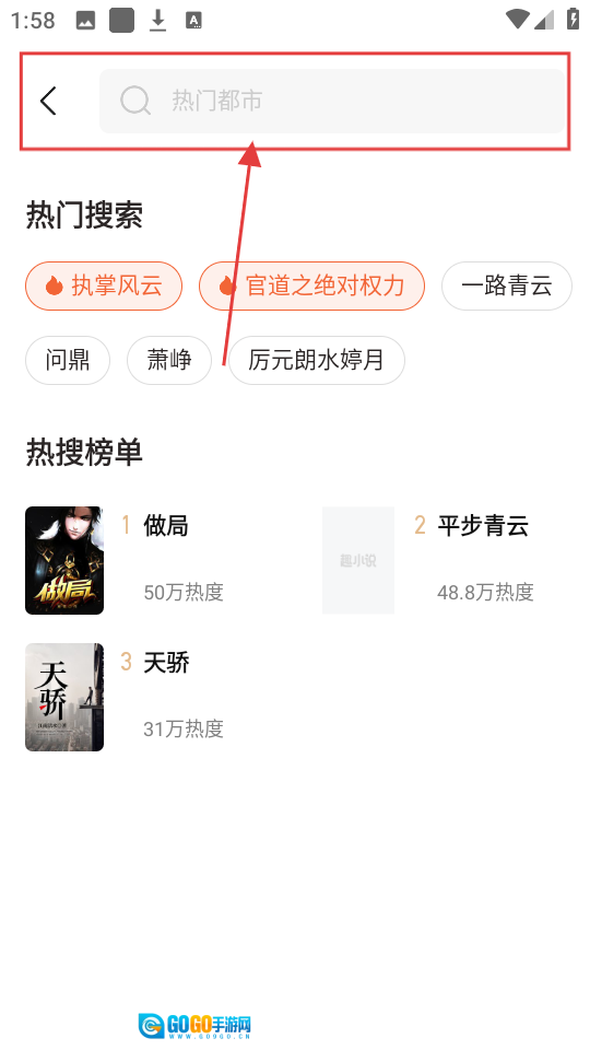 进入搜索界面后,在搜索框输入关键词,还能看到热门搜索和热搜榜单,找小说超方便哦。