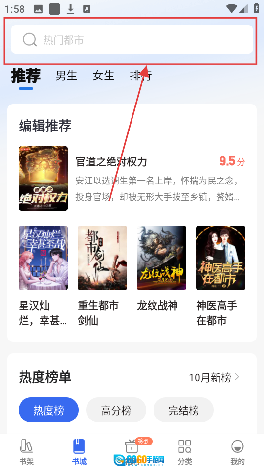 1、在书城页面找到搜索框并点击,输入你感兴趣的小说名称或类型,即可搜索到你心仪的小说。
