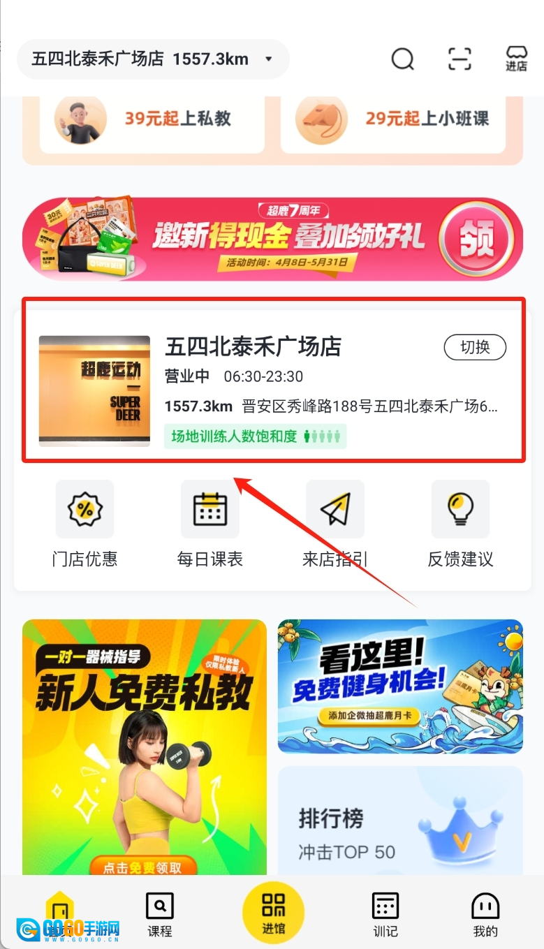 1、第一步,我们先进入福州超鹿运动的课程界面,然后在这个界面里找到一家健身房。