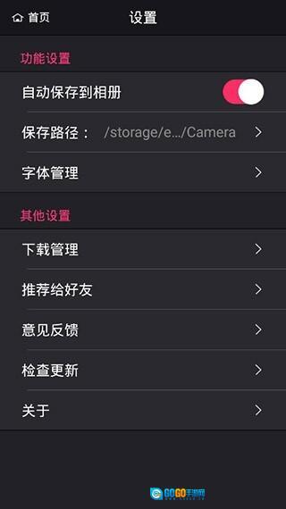 5、点击“齿轮”形状的图标,进入设置页面,在该界面中能够进行图片保存路径的设置、字体的管理以及意见反馈等相关操作。