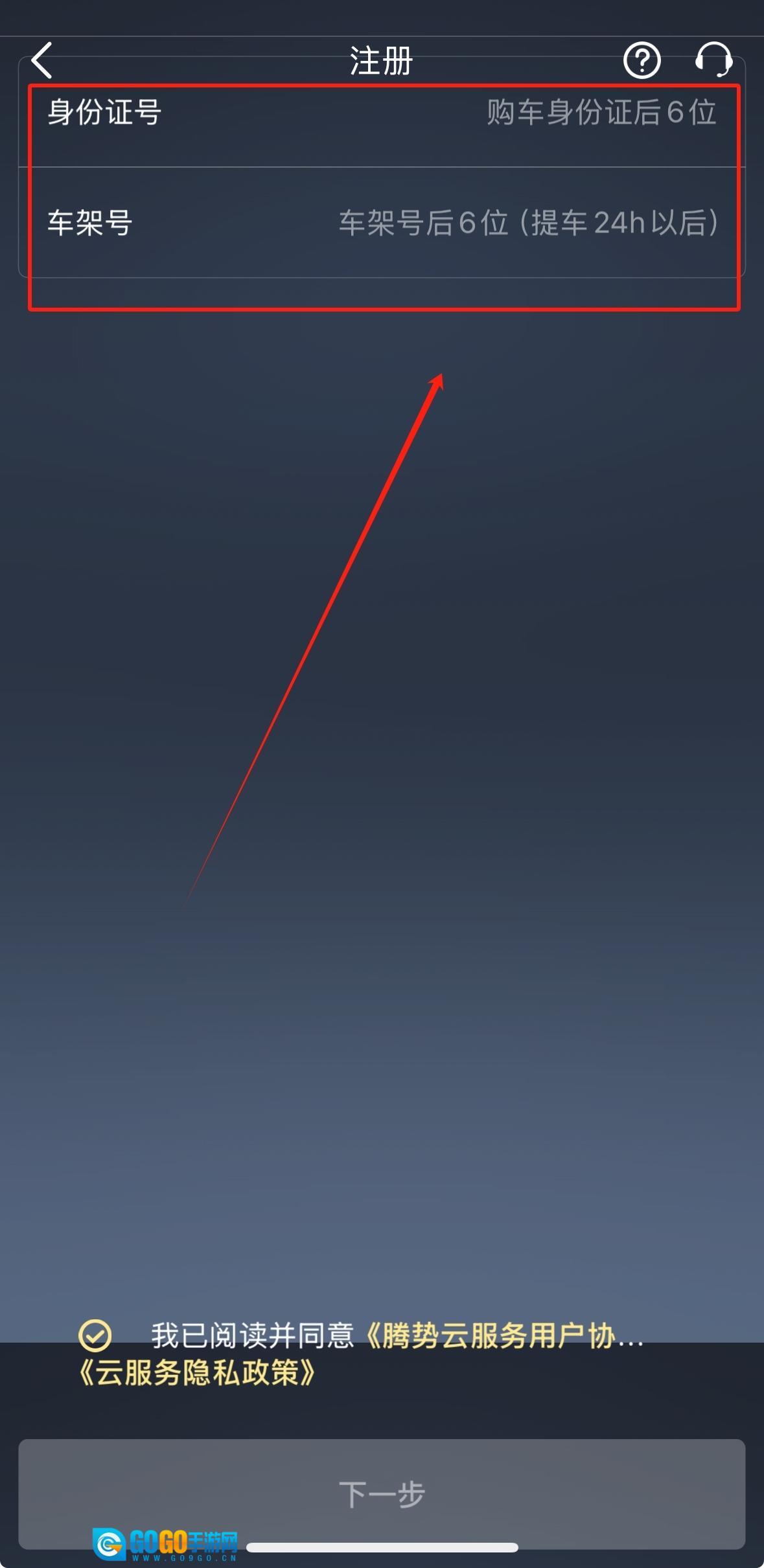 2、点击注册按钮,输入身份证号码以及车架号的后六位数字,随后点击下一步操作即可完成。