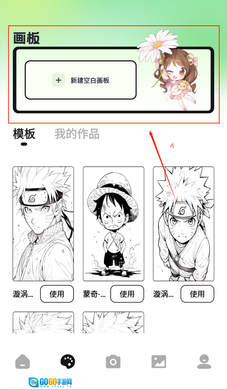 1、点击底部的创作图标进入画板页面后,可选择新建空白画板或是使用模板;模板区里有漩涡鸣人等各类动漫角色线稿,很适合初学者当作练习素材。