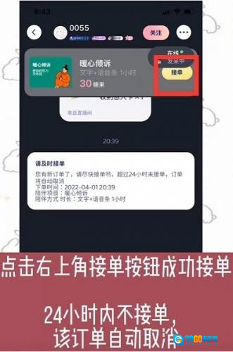 2、点击右上角的接单按钮即可成功接单,若24小时内未进行接单操作,该订单将自动取消。