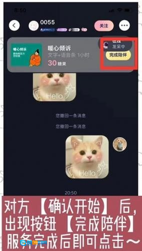 4、待对方点击【确认开始】后,界面会出现【完成陪伴】按钮,服务结束时点击该按钮即可~