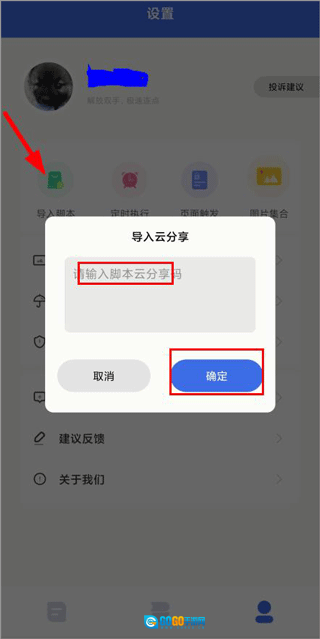 3、打开我的,点击导入脚本,输入脚本分享码即可。