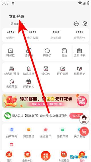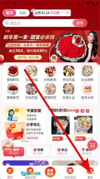 1、打开花递鲜花首页后,点击底部的“我的”按钮,即可进入个人页面。