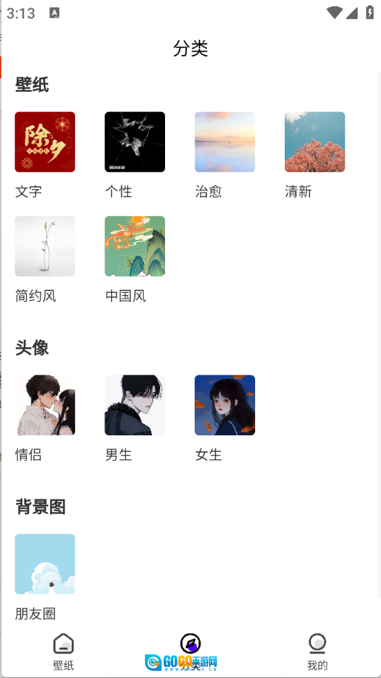 3、“分类”页面包含头像、壁纸、朋友圈背景图等内容。
