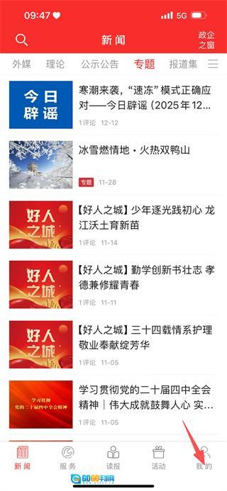 1、在新闻页面,点击底部的我的选项,即可进入个人页面。