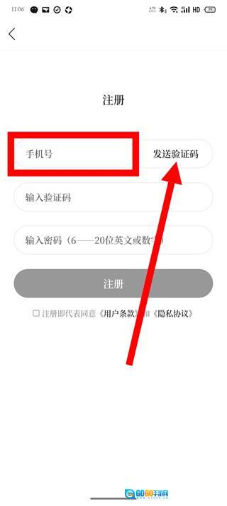 4、在注册页面,输入手机号,点击发送验证码。