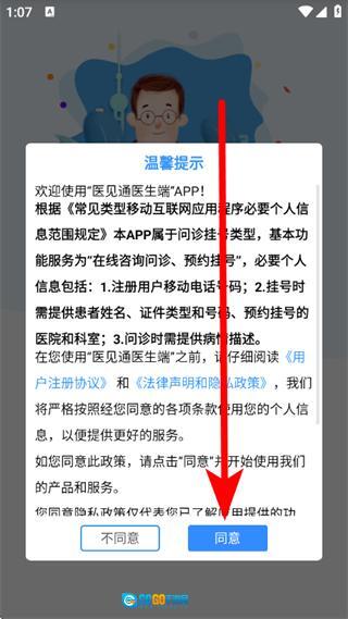 1、打开医见通,在温馨提示弹窗中,点击同意,进入登录页面。