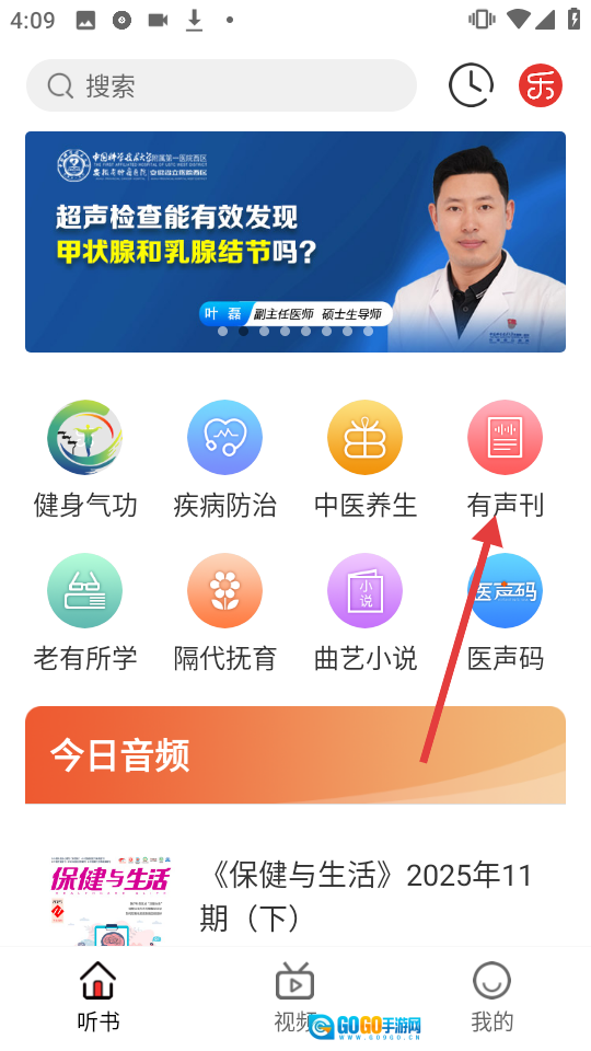 2、在有声刊板块里,找到《保健与生活》2025年11期(下),点击进入它的详情页。