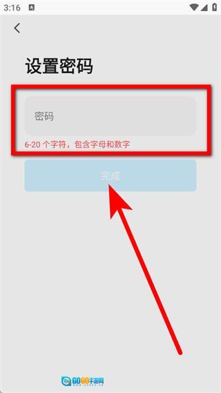 4、在设置密码页面,设置密码,点击完成,完成注册。