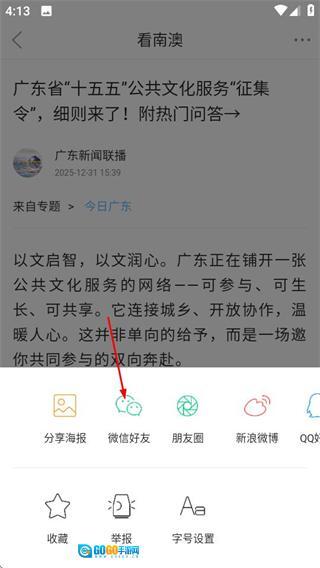 3、在文章详情页,点击分享按钮,可展开分享选项菜单。