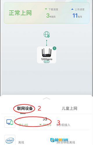 2、点击【首页】中的【联网设备】选项,从中挑选出需要进行限速操作的用户。