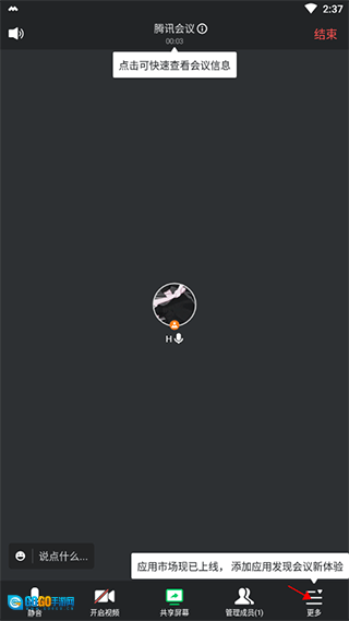 4、在已创建的会议界面里,找到界面右下角的“更多”按钮,点击该按钮。
