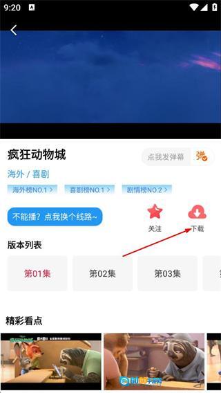 3、进入疯狂动物城的播放页面后,点击对应按钮,选择需要缓存的视频页面。