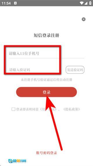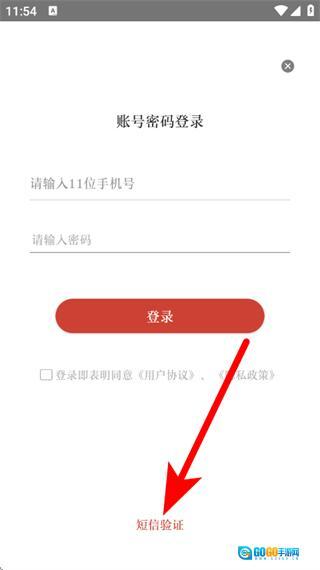 3、在账号密码登录页面,点击短信验证,进入短信登录注册页面。
