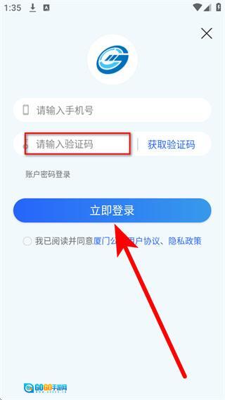 4、把收到的短信验证码输入到验证码栏,勾选相关协议后,点击立即登录按钮,即可完成账号登录操作。