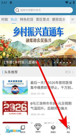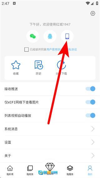1、打开红城1947应用,进入首页后,点击页面底部的“我的”选项,即可进入个人中心页面。