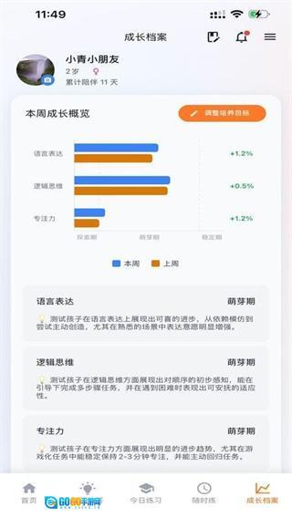 具备详尽的儿童成长档案记录功能,能够全面整合孩子成长轨迹、日常表现、练习结果等各类信息,支持查看孩子每周的成长概览,内容覆盖全面且条理清晰,便于家长整体掌握孩子的成长情况。
