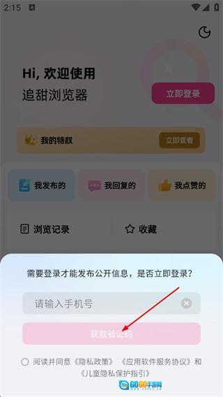 3、在登录弹窗中,填写请输入手机号,点击获取验证码按钮。