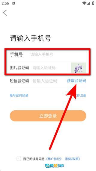 3、在登录页面,输入手机号和图片验证码,点击获取验证码。
