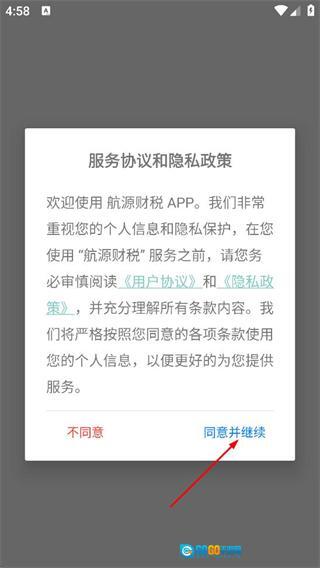 1、阅读用户协议和隐私政策后,点击同意并继续,进入航源财税的首页。