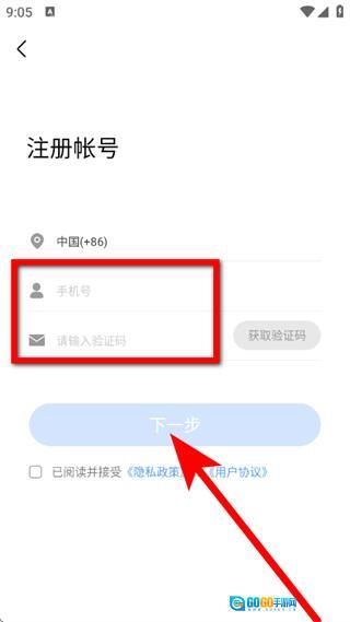 4、在注册页面,输入手机号和验证码,点击下一步。