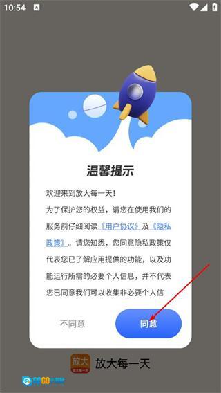 1、阅读用户协议及隐私政策后,点击同意,进入放大每一天的主界面。