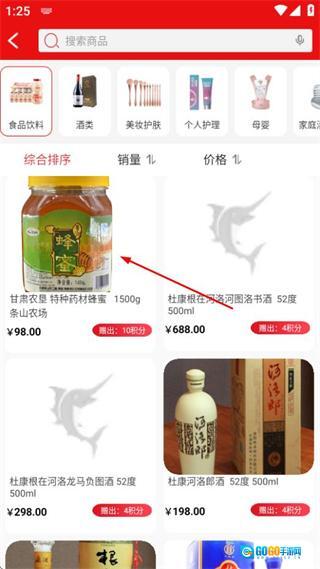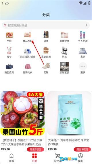 2、在分类页面,点击食品饮料分类,可进入对应商品列表页面。
