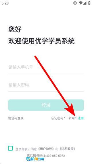1、打开优学学员系统,在欢迎登录页面点击新用户注册,进入选择感兴趣项目界面。