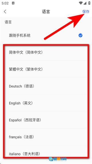 4、在语言页面,选择需要的语言,点击右上角保存,完成语言设置。
