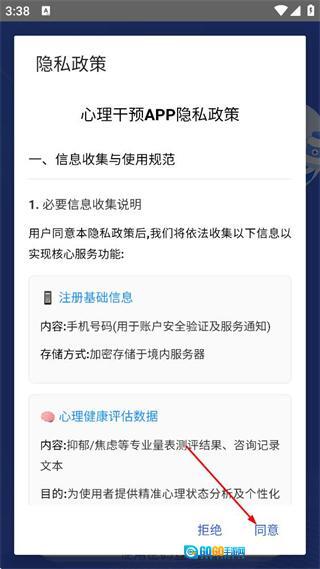 1、阅读心理干预隐私政策后,点击同意按钮,进入登录页面。