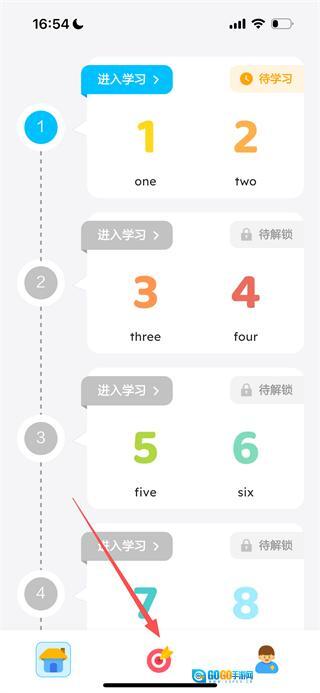 1、进入首页后,点击底部的中间功能按钮,可进入单词学习页面。