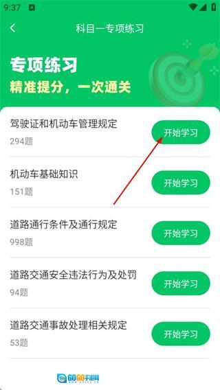 2、在专项练习页面,选择目标知识点并点击开始学习按钮,可进入该知识点的答题页面。