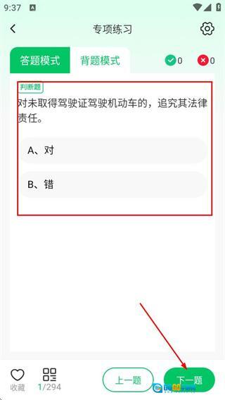 3、在答题页面完成题目选择后,点击下一题按钮可继续进行答题练习。